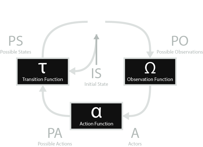 - the Possible Observations, represented by PO, which consists of all ways in which the State can be outputted to Actors as a result of the Observation Function, with a corresponding observation for each Possible State