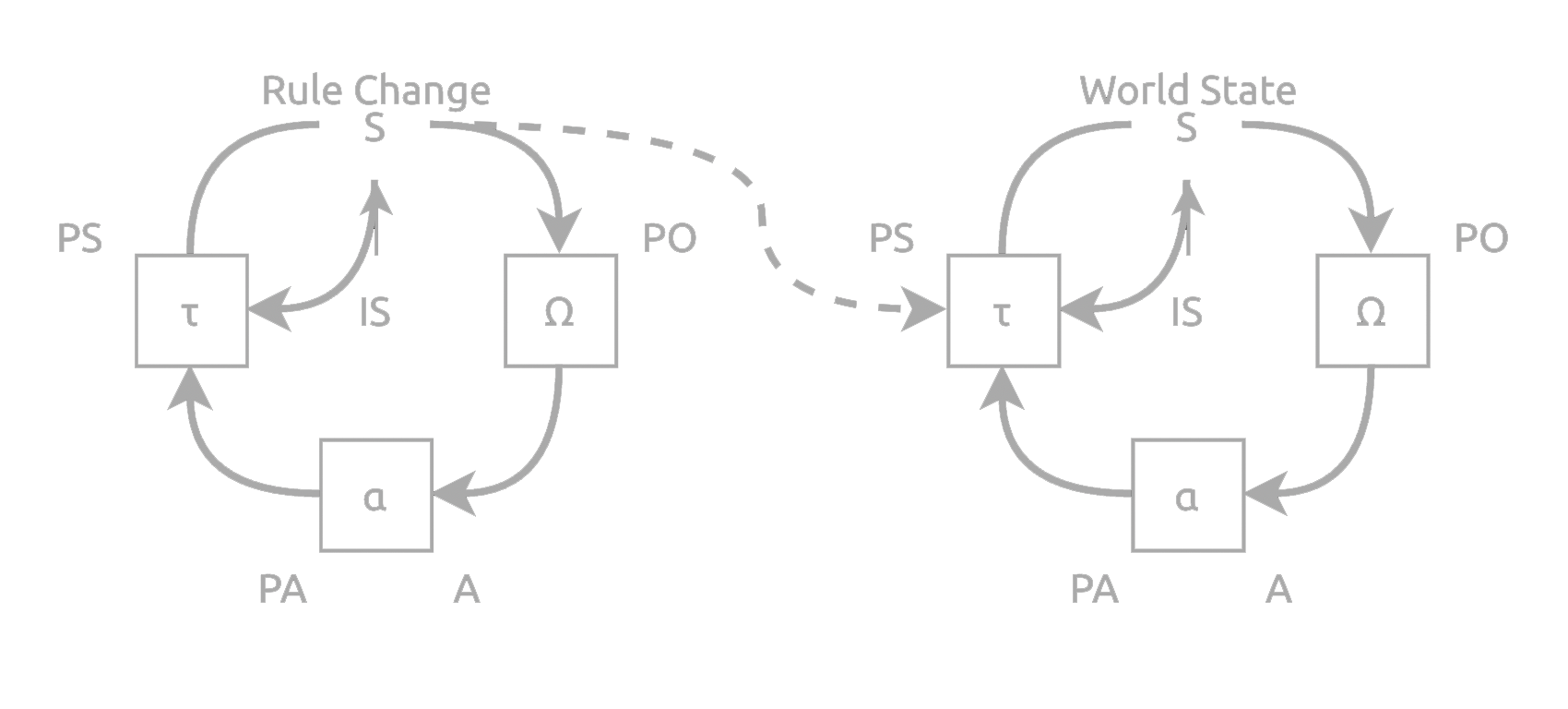 - the Transition Function, represented by tau (τ), which consists of the rules followed upon receiving input from the Action Function to change the process’ State